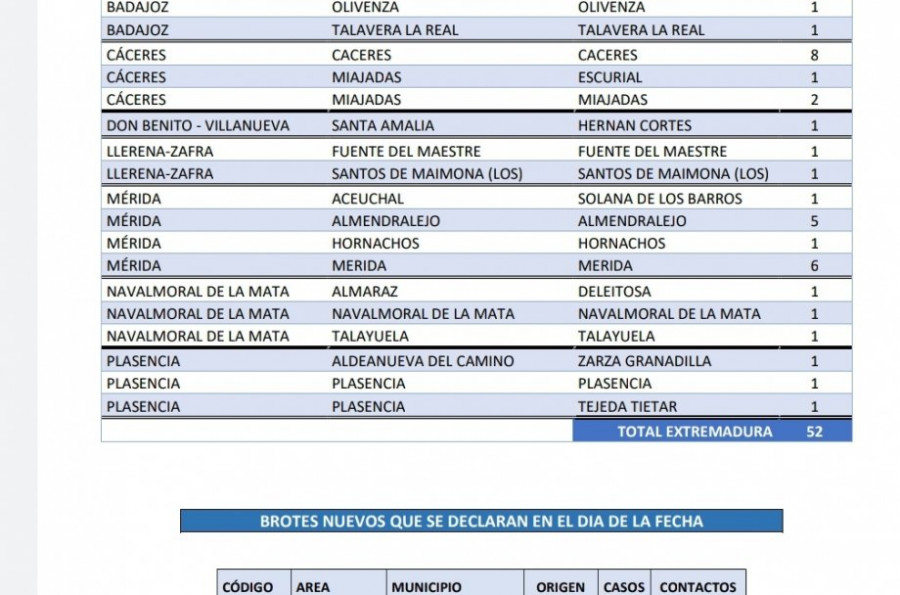 Se notifican 3 brotes, dos en Almendralejo con 5 positivos cada uno y 32 y 30 contactos, y un brote en Cáceres con 3 positivos y 6 contactos. Se cierra un brote, el 270, de Valdecaballeros.