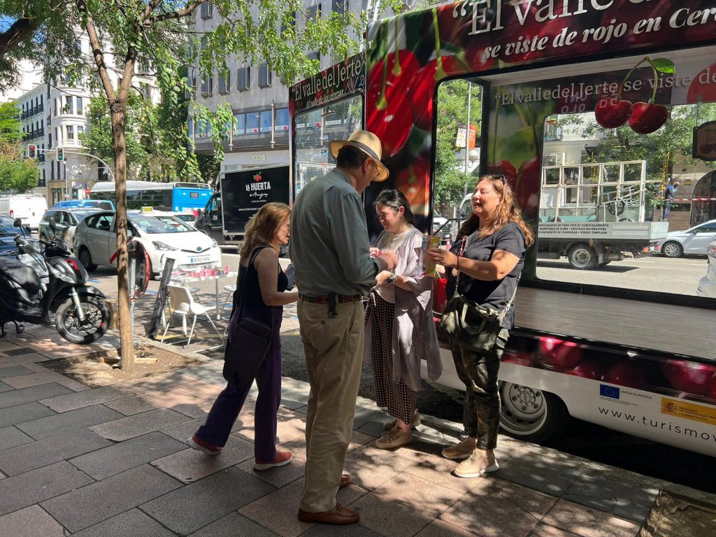 Durante estos dos días, una camioneta decorada con fotografías de productos del Valle del Jerte recorre calles del centro de la capital.