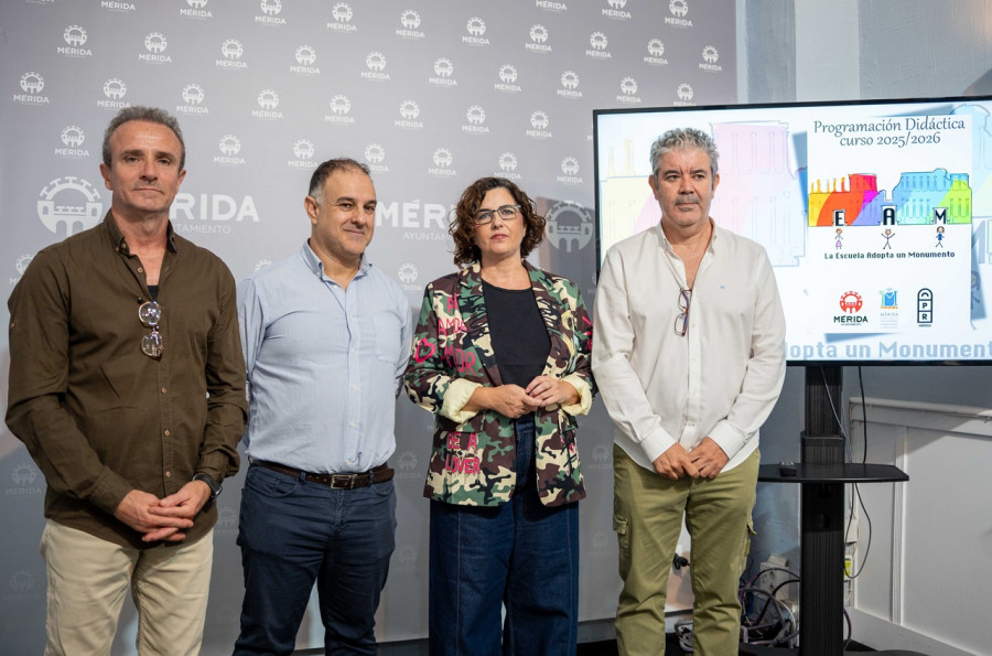 La delegada de Educación, Susana Fajardo, y el director del Consorcio de la Ciudad Monumental, Félix Palma, han presentado la XV edición del programa didáctico “La Escuela Adopta un Monumento” para el curso 2025/2026. A la presentación también han asistido el director del CPR de Mérida, Mario Moreno, y el asesor de Innovación Educativa de este centro, Manuel Marín.