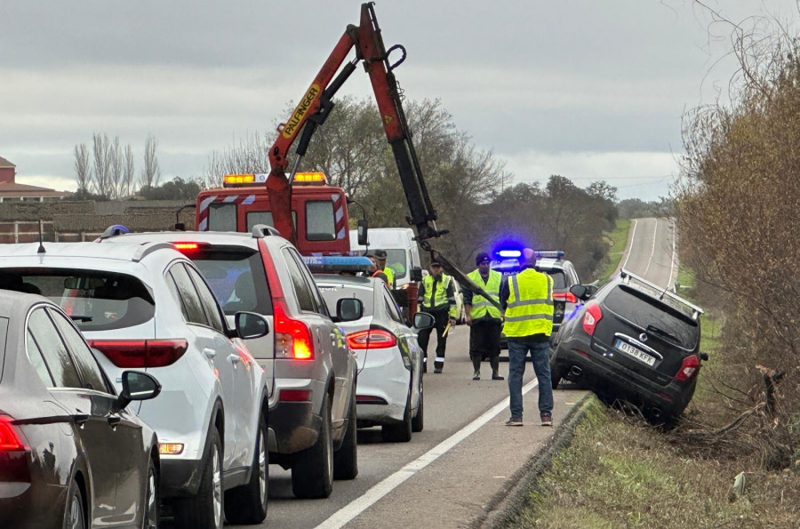 Los trabajos para retirar el vehículo accidentado provovaron retenciones importantes en la tarde de este sábado en esta vía que une las localidades de Moraleja y Coria.