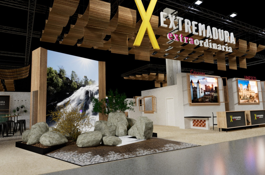 El stand de la región está inspirado en el concepto de 'Extremadura Extraordinaria' -lema por el que se apuesta un año más- y que invita a un viaje más emocional y sensorial. "Es un espacio inmersivo y sensorial, pensado para que quienes nos visiten sientan que entran en Extremadura. La letra X se convierte en el eje del relato, como ese punto en el mapa donde señalamos que hay algo valioso, ese tesoro", ha señalado Bazaga.